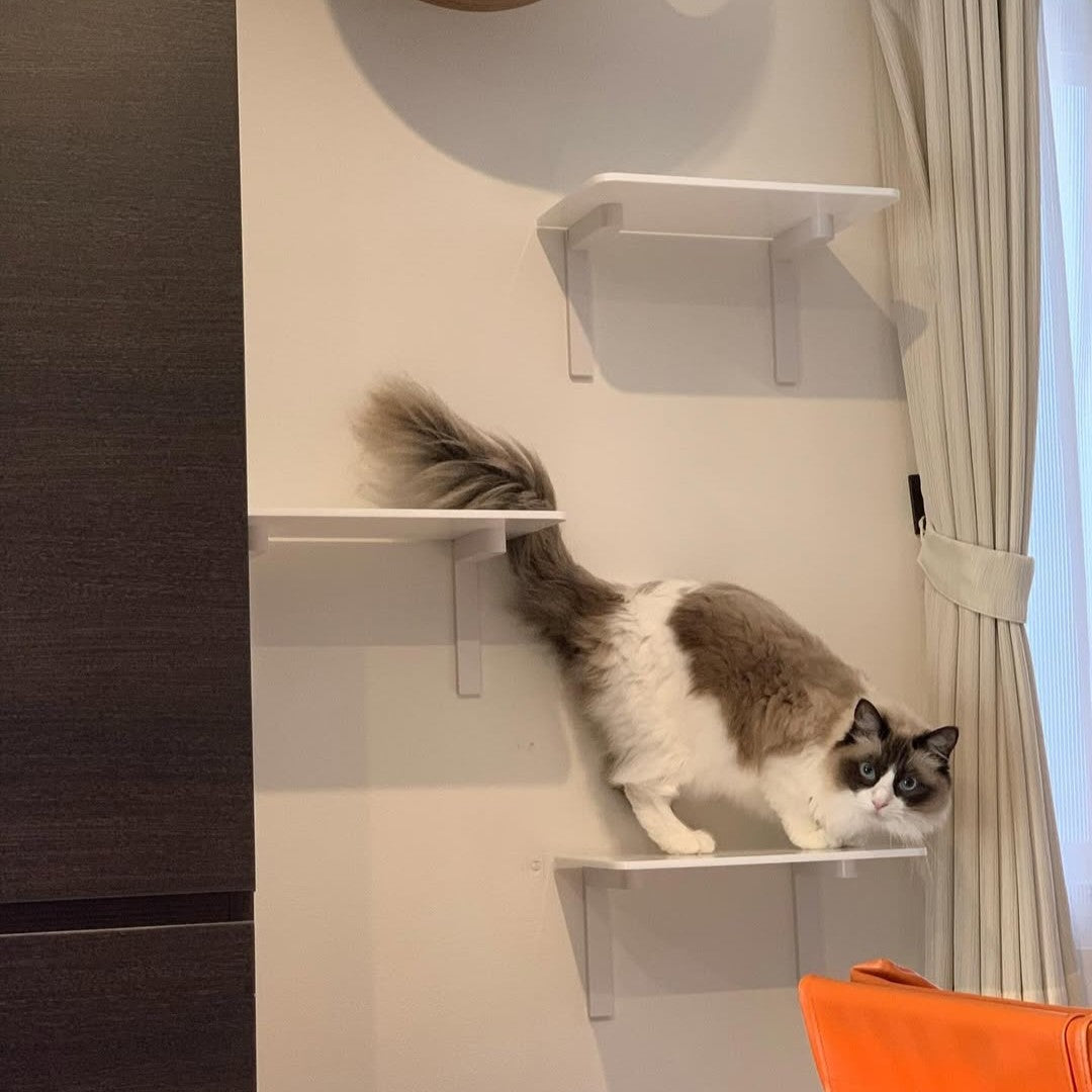 猫ちゃんの遊び場を広げるキャットステップ3枚セット(クリア/ホワイト/ホワイトクリアの3種類)。石膏ボードの壁に取り付け可能。金具の取り付けに特別な工具は不要、付属のスティックを使ってピンを挿し込むだけで簡単に取り付けができます。ステップ部分はマグネットで固定するので、簡単に取り外しでき、模様替えや掃除もラクラク!猫ちゃんの肉球でも滑りにくい素材でできています。