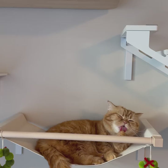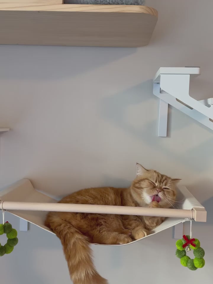 石膏ボードの壁に取り付け可能なキャットハンモック。金具の取り付けに特別な工具は不要、付属のスティックを使ってピンを挿し込むだけの簡単取り付け。快適なハンモックデザインで、猫ちゃんがリラックスしてくつろげます。丈夫な素材で耐久性も抜群。